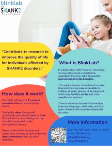 The SHANK2 Foundation is collaborating with BlinkLab on a research study to better understand brain function in SHANK2 disorders. This research study is currently enrolling. Website: www.blinklab.org.